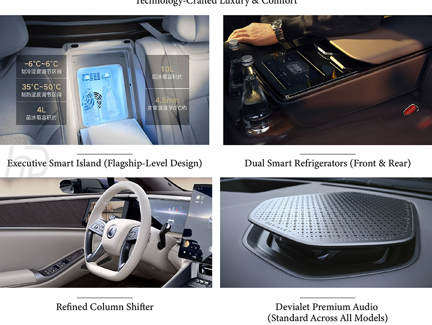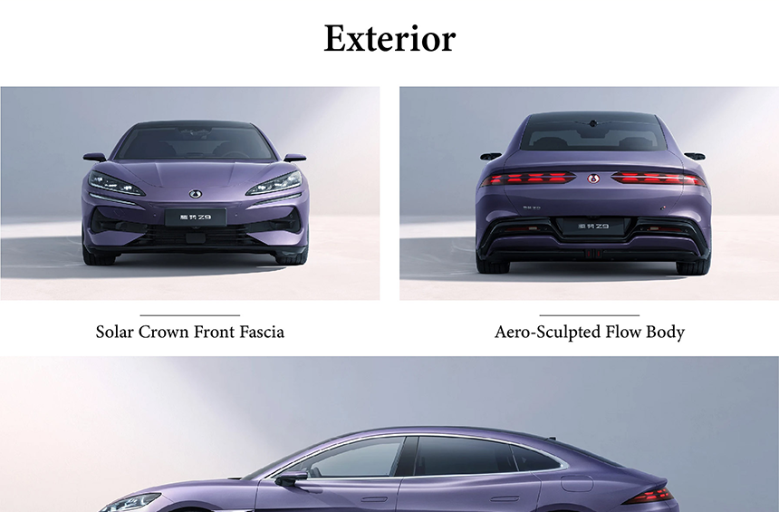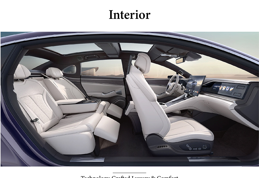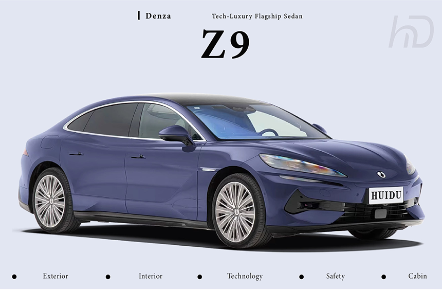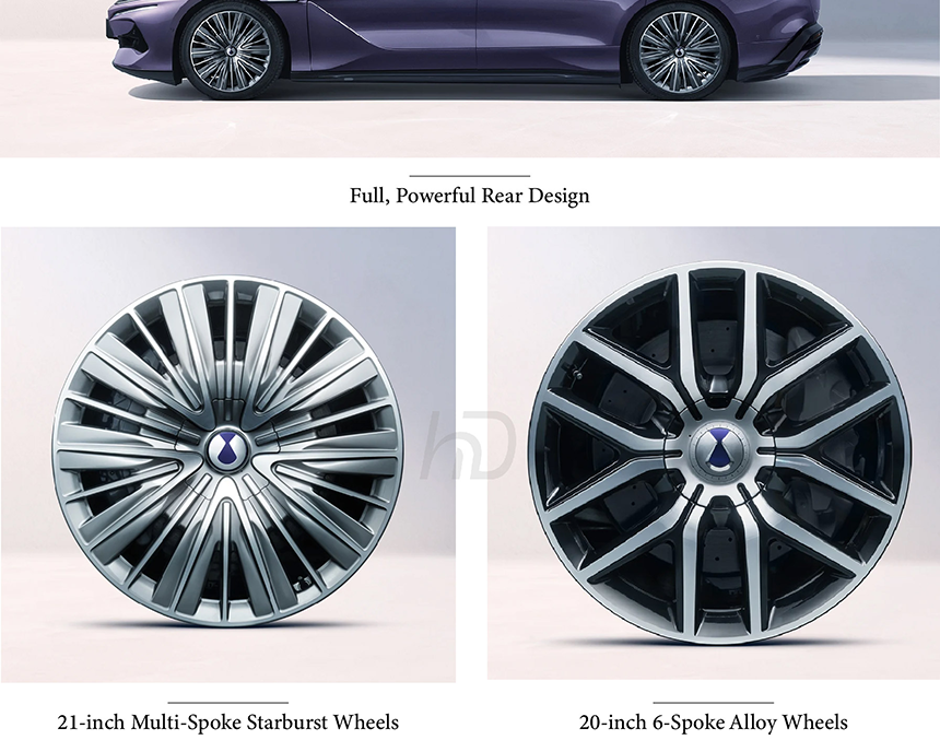 The Denza Z9 showcases an aero-sculpted flow body that seamlessly blends elegant curves with functional aerodynamics, achieving an exceptional 0.22Cd drag coefficient. Its full, powerful rear design features a muscular shoulder line that flows into a distinctive light strip spanning the entire tailgate. The precisely engineered surfaces create dynamic light reflections that emphasize the vehicle's premium presence. This sophisticated exterior design perfectly balances emotional aesthetics with cutting-edge aerodynamic efficiency.