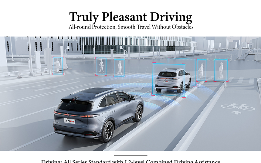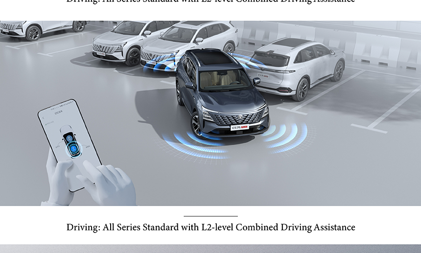 The Changan CS75 4th-gen PLUS Ultra elevates driving intelligence with four core ADAS functions: Adaptive Cruise Control (ACC) maintains optimal following distance, Lane Centering Assist (LCA) ensures precise lane positioning, Intelligent Offset Assist provides safe passing maneuvers, and Traffic Jam Assist (TJA) automates stop-and-go driving. The revolutionary APA 5.0 Automatic Valet Parking enables fully autonomous parking in complex scenarios while the Parking Space Memory Assistant records frequently used parking routes. These systems work synergistically through multi-sensor fusion to create a comprehensive driving assistance ecosystem. This represents Changan's technological breakthrough in making advanced autonomous features accessible for everyday driving scenarios.