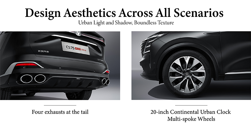 The Changan CS75 4th-gen PLUS Ultra commands attention with its aggressive 20-inch Continental wheel design, featuring precision-engineered alloy spokes that enhance both visual impact and road-holding capability. The dramatic four-outlet exhaust system delivers an authentic acoustic signature that amplifies the driving experience while optimizing exhaust flow efficiency. These performance-oriented elements are seamlessly integrated with the vehicle's muscular body contours and athletic stance. The harmonious combination of premium wheel aesthetics and passionate exhaust design establishes a bold visual identity that perfectly balances sophisticated styling with dynamic performance cues.