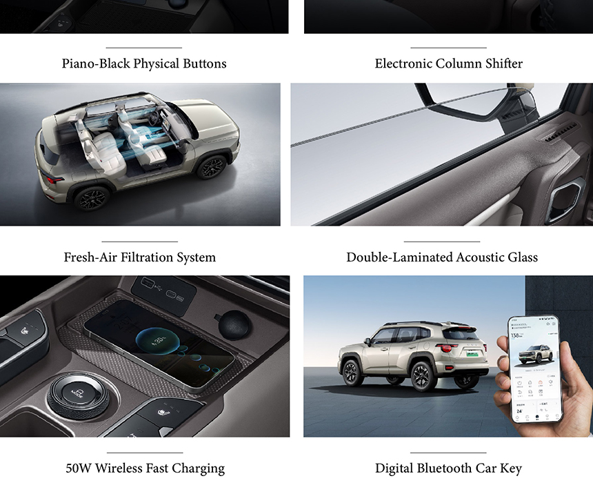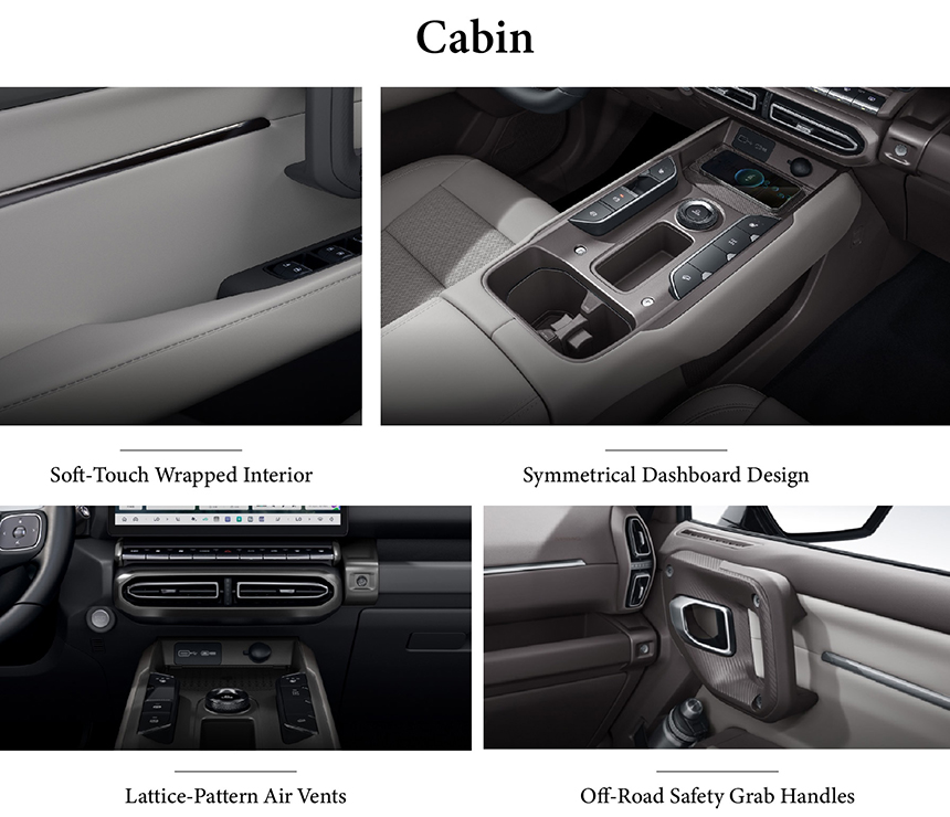 The Haval Dargo's interior balances a tough persona with everyday comfort through its soft-touch wrapped interior, offering a pleasing and durable tactile experience. Its driver-focused cockpit is organized around a clear symmetrical dashboard design, promoting intuitive operation. Distinctive lattice-pattern air vents add a unique visual and functional detail. This thoughtful combination creates a cabin environment that feels both robust for adventures and refined for daily use.