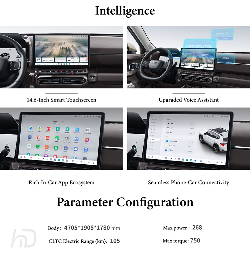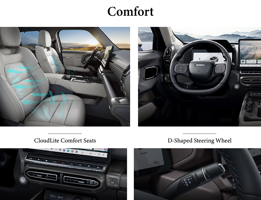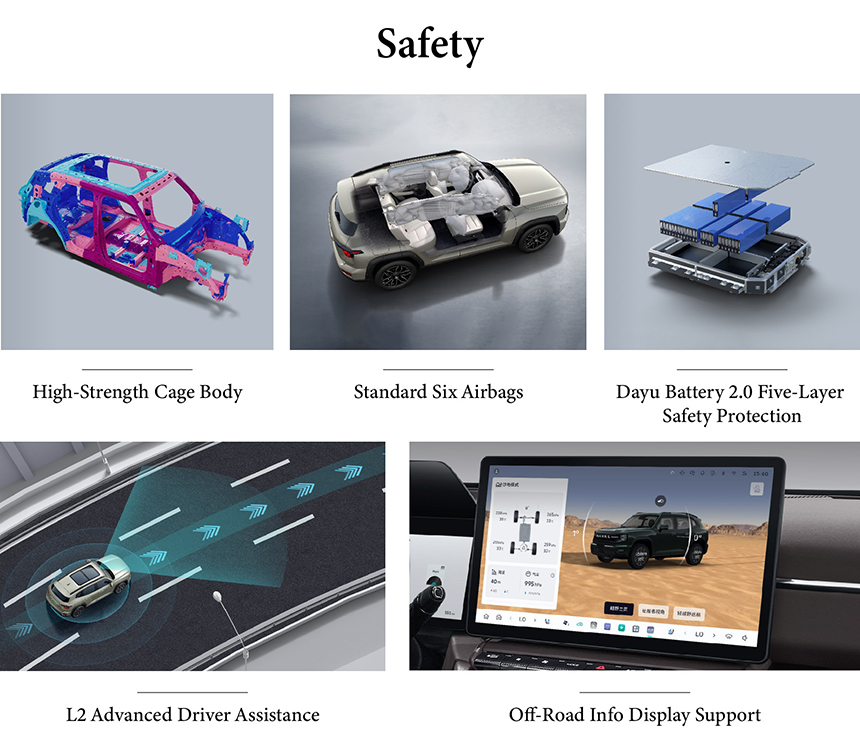 The Haval Dargo is engineered with a comprehensive safety-first approach, built upon a robust High-Strength Cage Body to form a protective passenger cell. It provides extensive occupant coverage with a Standard Six Airbags system for frontal and side-impact scenarios. Its new energy models feature the advanced Dayu Battery 2.0 Five-Layer Safety Protection, integrating mechanical, electrical, and thermal safeguards for ultimate battery integrity. These multi-layered defenses work in concert to deliver outstanding safety assurance for every journey.