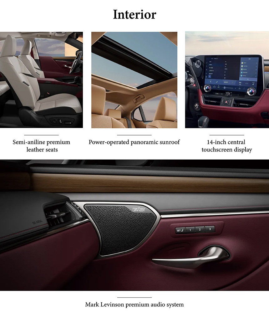 Inside the Lexus ES, passengers are greeted by semi-aniline premium leather seats that offer exceptional comfort and sophisticated tactile elegance. A power-operated panoramic sunroof bathes the cabin in natural light, enhancing the sense of spaciousness and openness. These elements are integrated within a meticulously crafted, acoustically serene environment. Together, they define an interior sanctuary focused on refined well-being and understated luxury.