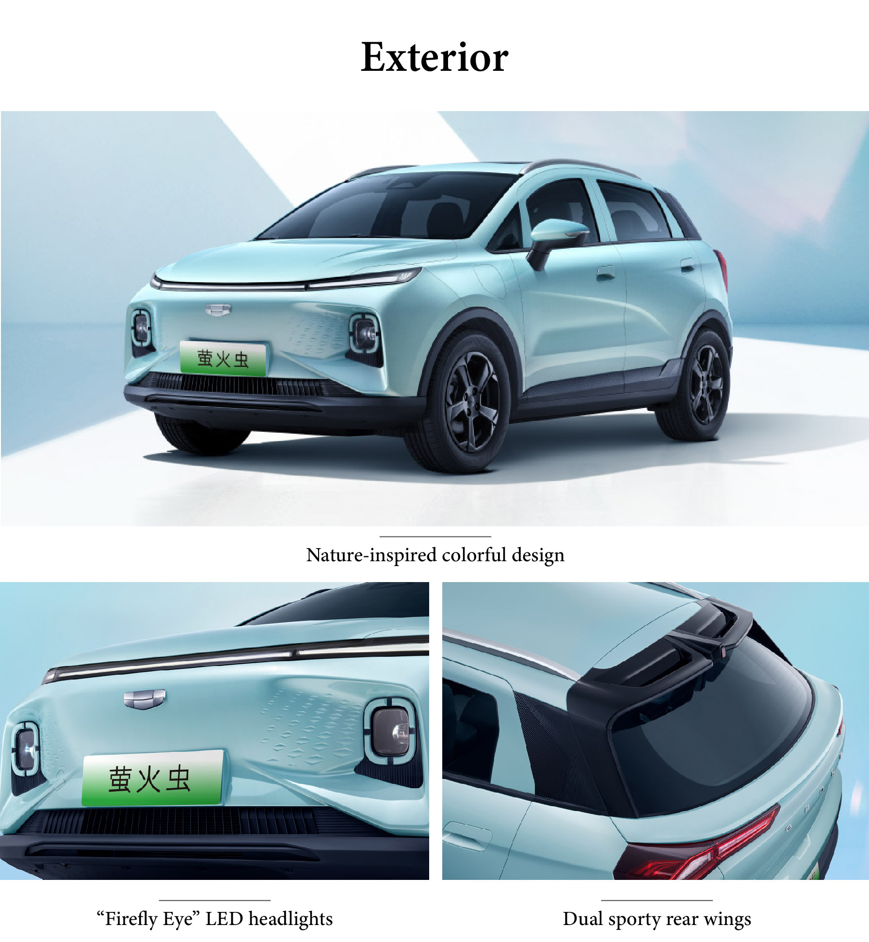 The Geely Geometry E Firefly captivates with its Nature-inspired colorful design, featuring vibrant, energetic hues that reflect a youthful, eco-conscious spirit. Its front fascia is highlighted by distinctive "Firefly Eye" LED headlights, delivering bright, expressive illumination that echoes its namesake's gentle glow. The dynamic profile is accentuated by Dual sporty rear wings, adding a touch of athletic flair while enhancing aerodynamic stability. Together, these elements create a charming, spirited exterior that perfectly balances playful aesthetics with modern functionality.