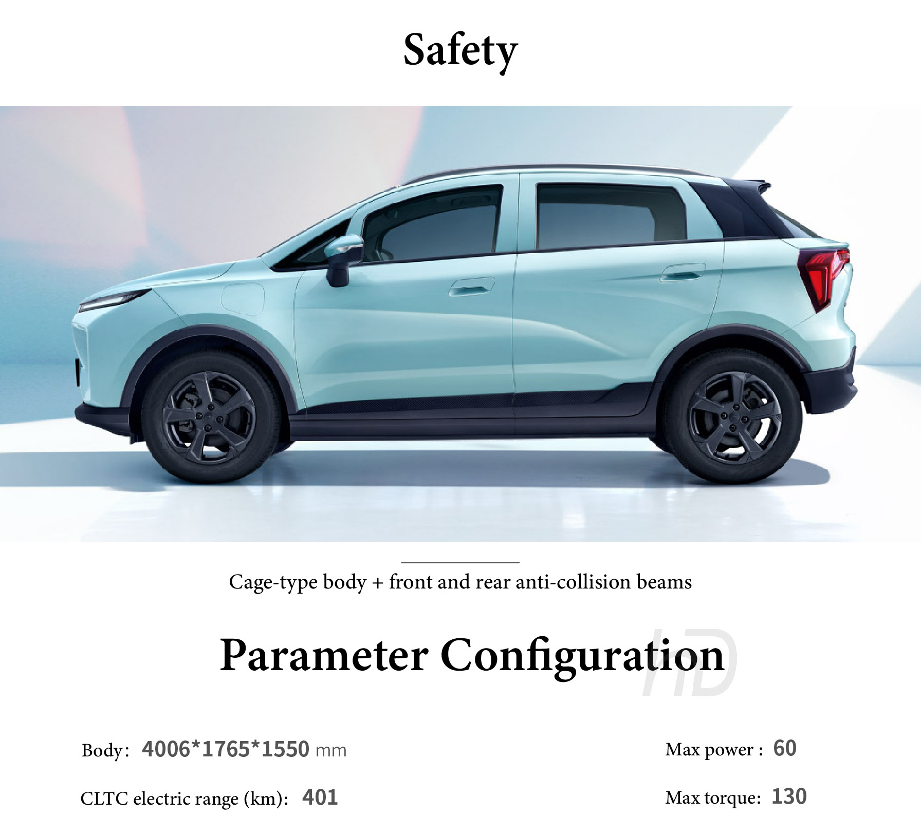 The Geely Geometry E Firefly is built upon a robust Cage-type body + front and rear anti-collision beams, forming a rigid protective framework that effectively absorbs and disperses impact energy. This integrated structure enhances passenger safety by maintaining cabin integrity in the event of a collision. The front and rear beams act as the first line of defense, mitigating damage to critical components and reducing impact forces. Together, these engineering elements deliver a solid safety foundation, providing reliable protection for both occupants and the vehicle's core systems.