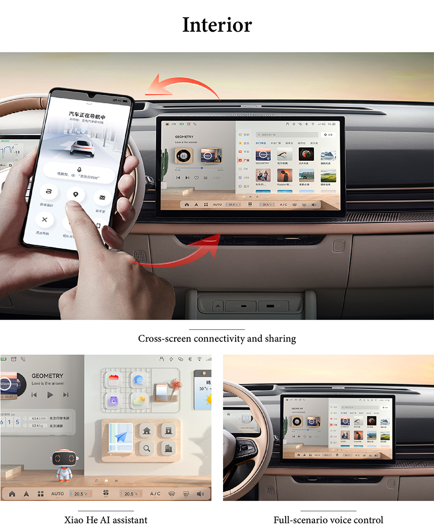 The Geely Geometry M6's interior is defined by Cross-screen connectivity and sharing, enabling seamless interaction between the central display, instrument cluster, and smart devices for a truly integrated digital experience. At its core, the Xiao He AI assistant acts as an intelligent voice companion, intuitively understanding natural commands to simplify navigation, media, and vehicle controls. With Full-scenario voice control, drivers and passengers can effortlessly manage virtually every cabin function—from climate to windows—using simple spoken instructions. Together, these technologies create a smart, responsive, and deeply intuitive cockpit designed for the connected lifestyle.