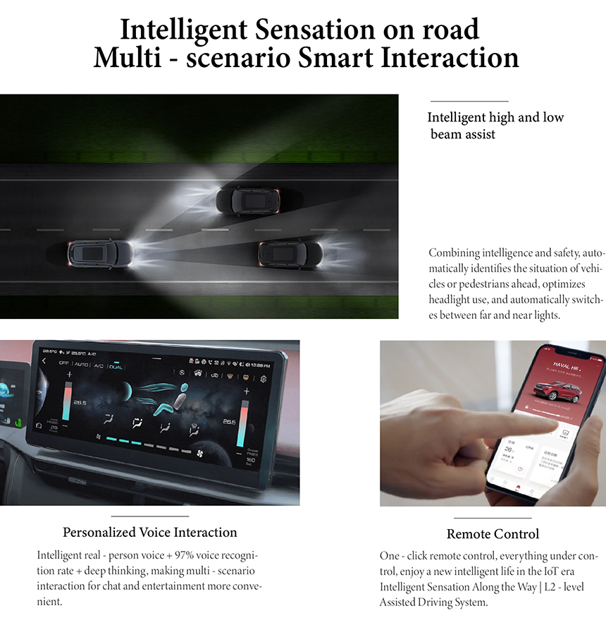 The Haval H6 is equipped with a comprehensive L2-level intelligent driving assistance system, enhancing safety and reducing driver fatigue. Key features include Adaptive Cruise Control (ACC) and Lane Keeping Assist (LKA) for relaxed highway cruising. The system adeptly manages stop-and-go traffic scenarios, providing smooth braking and acceleration in congested urban commutes. This integrated suite of technologies offers confident support, making every journey safer and more effortless.