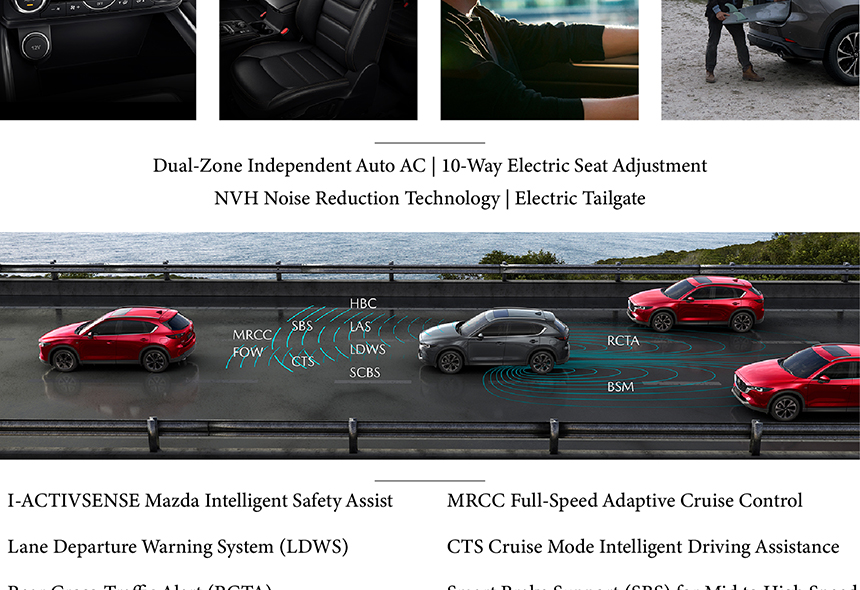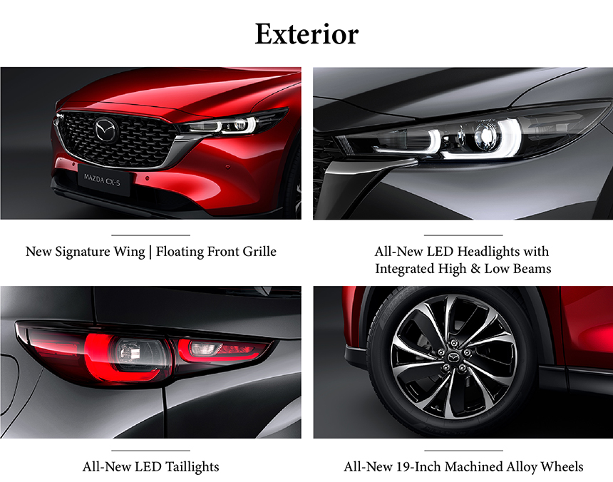 The Mazda CX-5 presents an elegantly dynamic exterior, highlighted by its new Signature Wing | Floating Front Grille, which creates a sense of lightness and forward motion. This sophisticated front end flows into a sculpted profile with clean, flowing character lines. At the rear, all-new LED taillights offer a sharp, modern punctuation with distinctive illumination. Together, these elements embody Mazda's KODO design philosophy of refined and emotive styling.