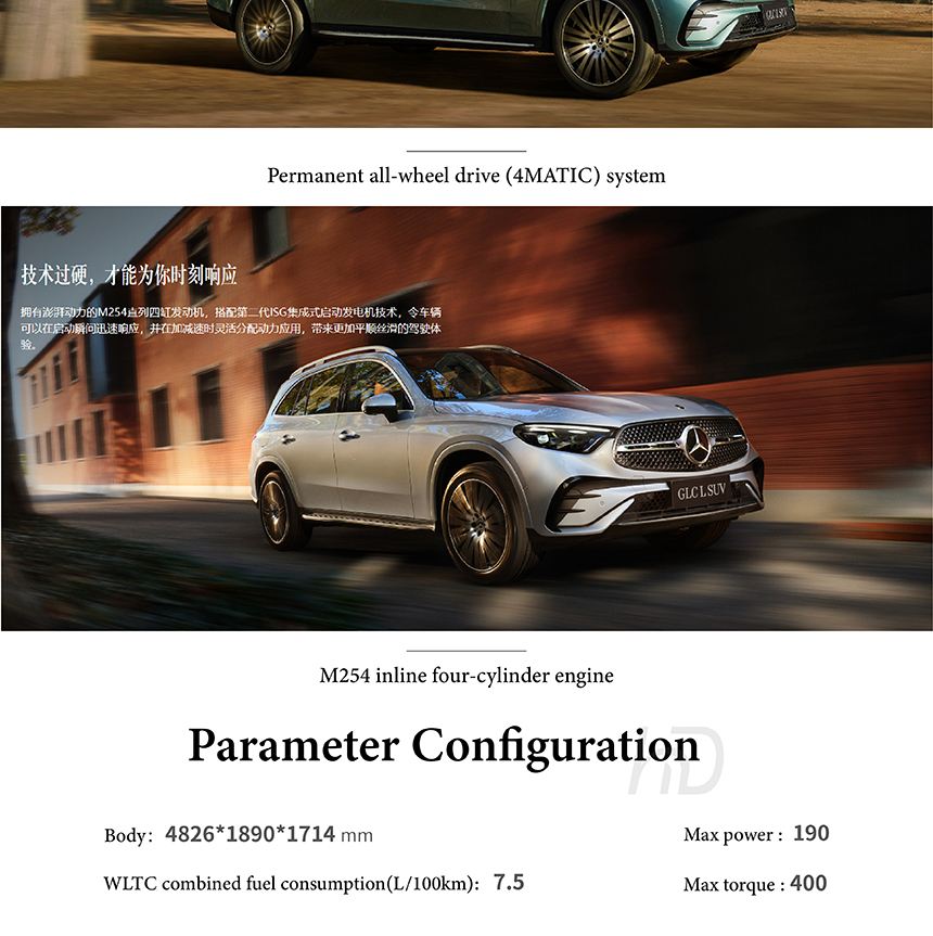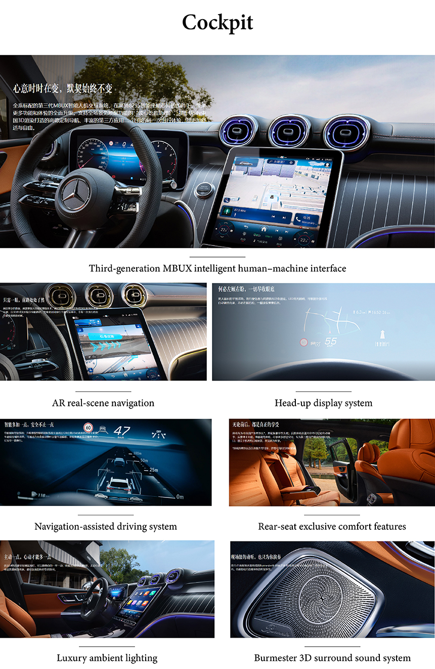 The Mercedes-Benz GLC cabin is centered around the advanced third-generation MBUX intelligent human–machine interface, offering intuitive touch, voice, and gesture control. A key feature is the head-up display system that projects key driving data directly onto the windshield, enhancing focus. The system features natural voice recognition and seamless connectivity for a personalized digital environment. This integration of cutting-edge interfaces creates a truly modern, driver-focused cockpit experience.