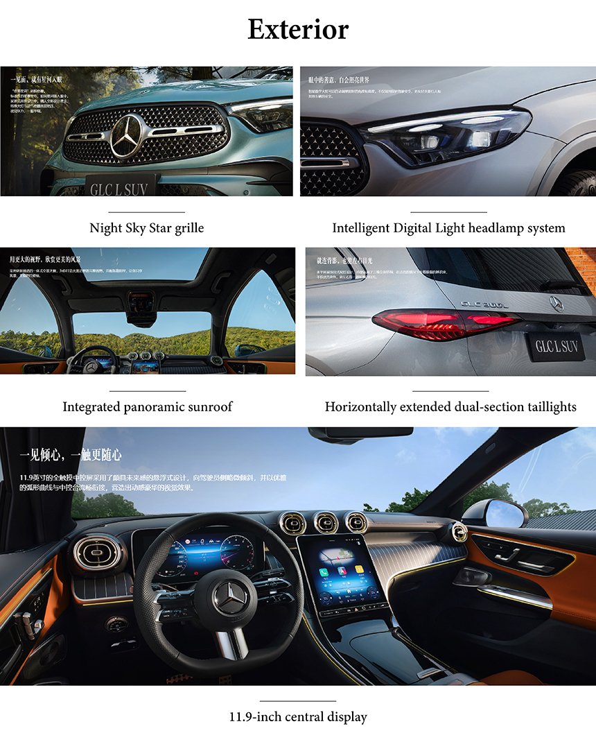 The Mercedes-Benz GLC presents a bold and athletic stance, elegantly blending classic SUV proportions with modern dynamic lines. Its front is dominated by the striking Night Sky Star grille, creating a confident and luminous signature appearance. At the rear, horizontally extended dual-section taillights provide a distinct visual identity, emphasizing width and sophistication. This cohesive design language projects an unmistakable aura of modern luxury presence on the road.