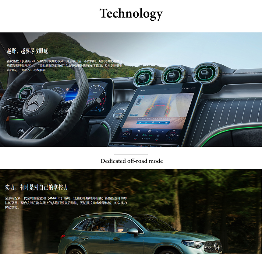 The Mercedes-Benz GLC seamlessly extends its capability from the road to diverse terrain with its advanced chassis technology. A key feature is the intelligent Dedicated off-road mode, which optimizes powertrain, suspension, and stability systems for confident traction. This is powered by the renowned Permanent all-wheel drive (4MATIC) system, ensuring optimal torque distribution for all conditions. Together, they provide versatile, sure-footed performance and refined control in any environment.