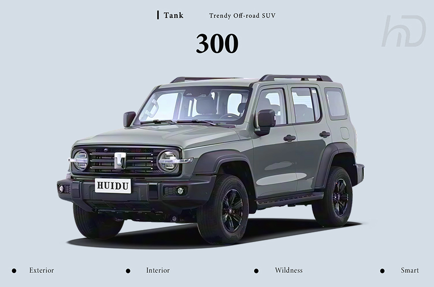 Tank 300's exterior masterfully blends classic boxy design with rugged capability, featuring a bold grille, circular LED headlights, and muscular wheel arches that balance retro charm with modern sophistication for both urban and off-road adventures.