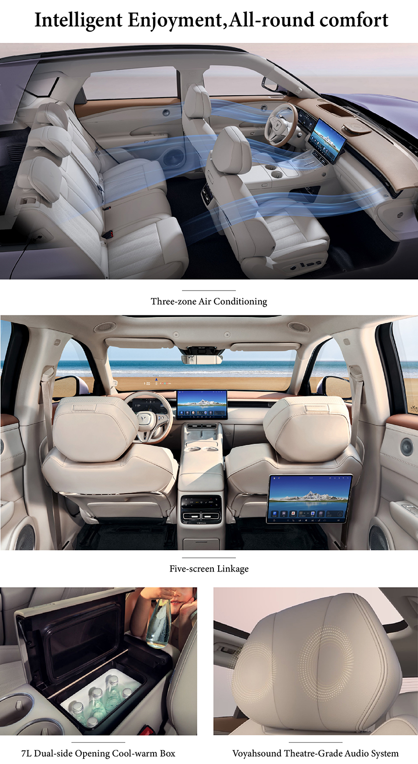 The VOYAH FREE+ features an intelligent cockpit centered around an expansive curved triple-screen display, integrating vital information and entertainment into a seamless panoramic interface. It is equipped with an advanced AI voice assistant that supports natural semantic recognition for intuitive, hands-free control of cabin functions. The system offers smart scenario modes that automatically adjust lighting, seating, and climate to match different driving or resting situations. Its open connectivity ecosystem and continuous OTA updates ensure the digital experience remains cutting-edge and personalized.